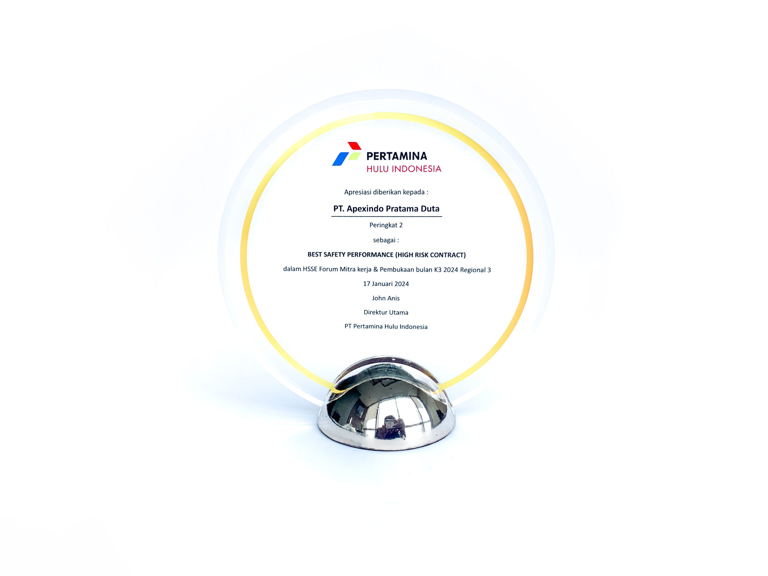 As a result of commitment and consistency of all Company’s personnel who always prioritize work safety, Apexindo received 2nd place appreciation as “Best Safety Performance (High Risk Contract)”. This appreciation was given by Pertamina Hulu Indonesia during the HSSE Forum of Working Partners & Opening of K3 Month 2024 Regional 3 on January 17, 2024.
