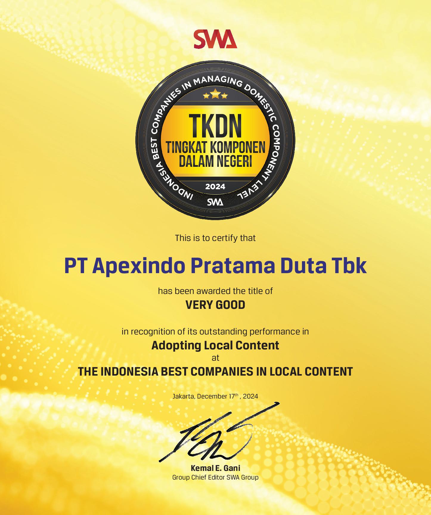Apexindo received an award from SWA Magazine as The Indonesia Best Companies in Local Content for its outstanding performance in Domestic Component Level/Tingkat Komponen Dalam Negeri (TKDN). Apexindo awarded the title of “Very Good” in Adopting Local Content.